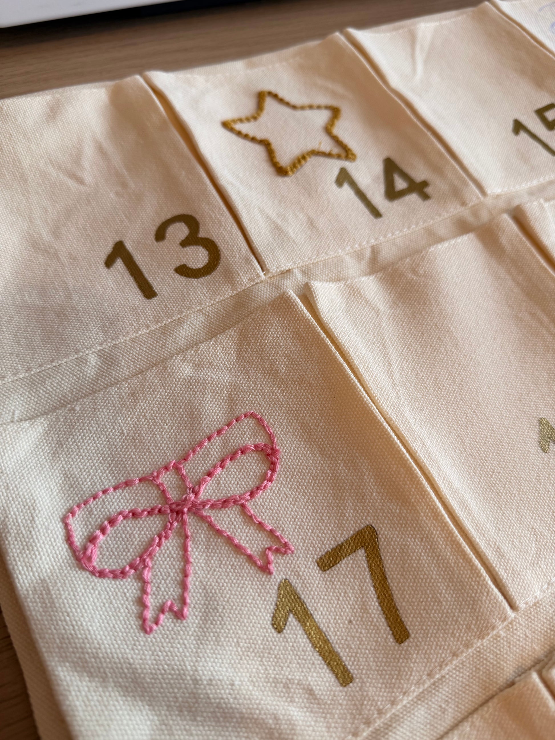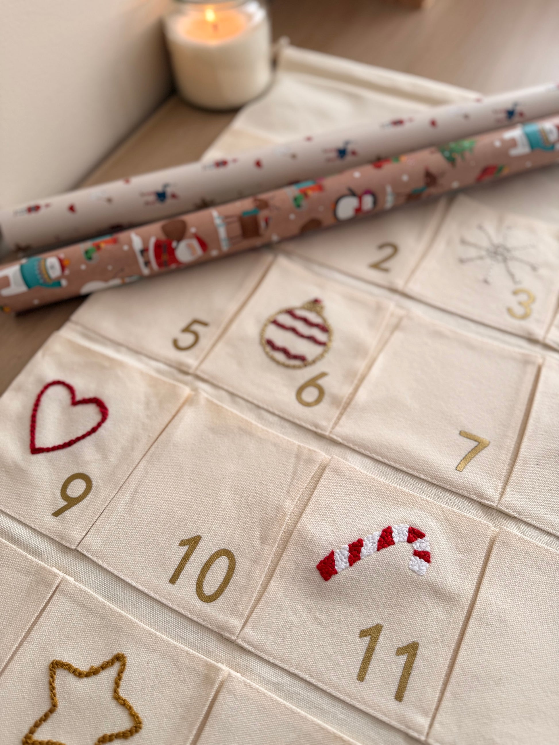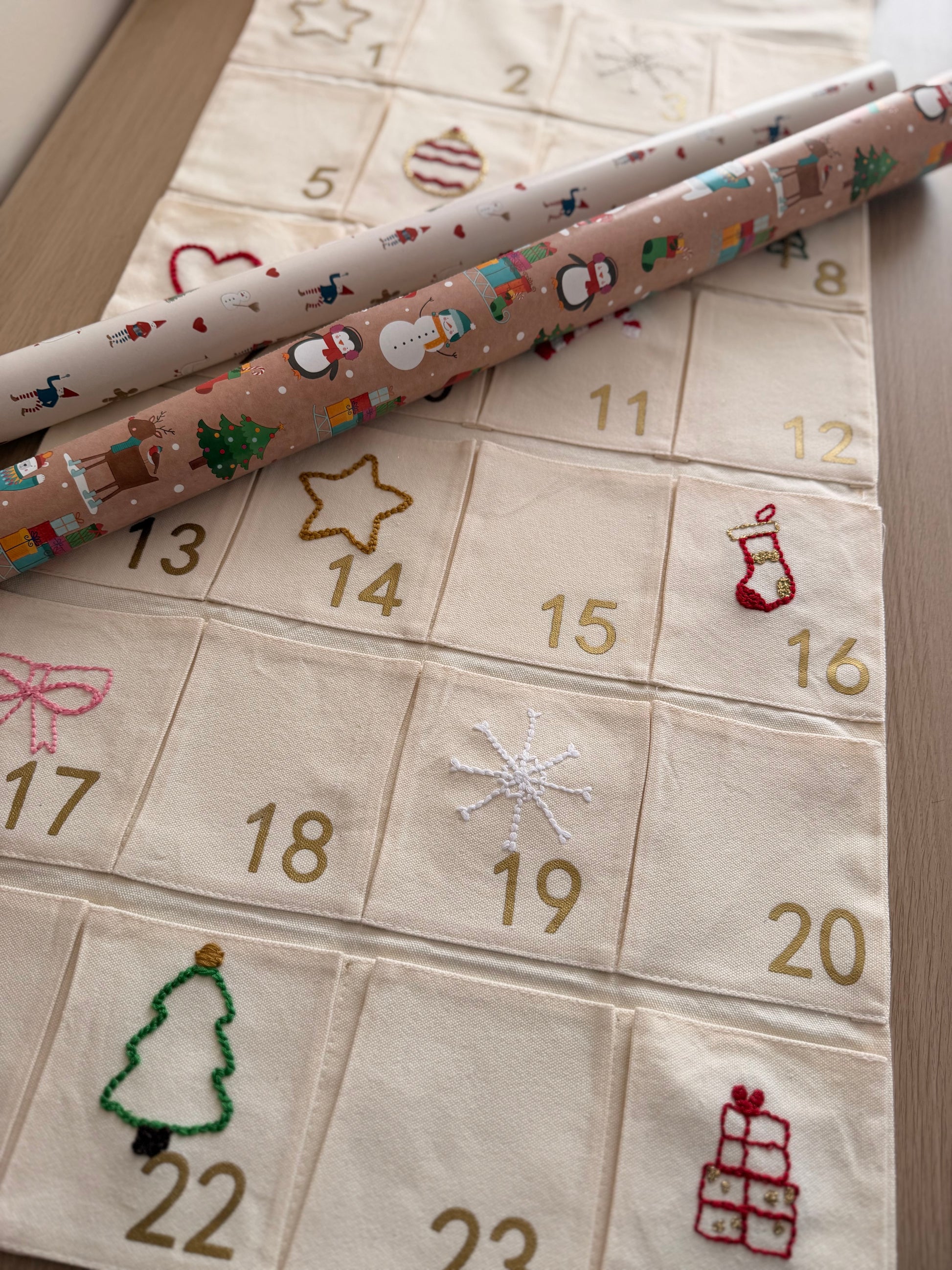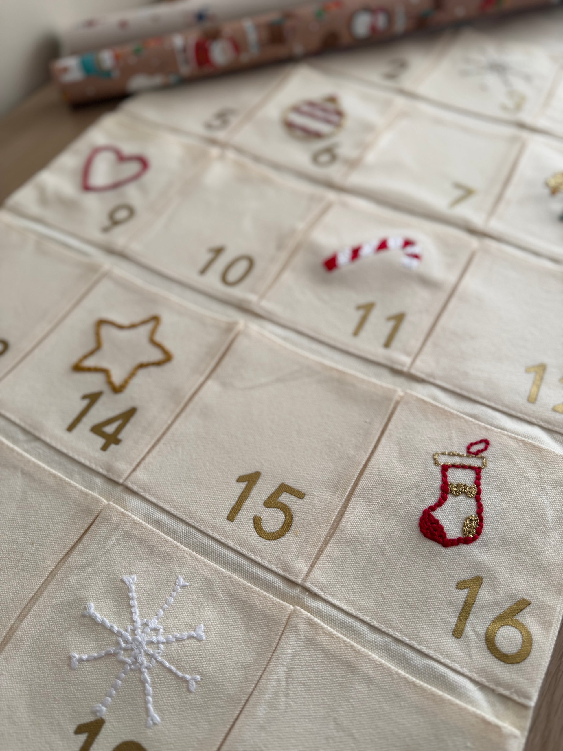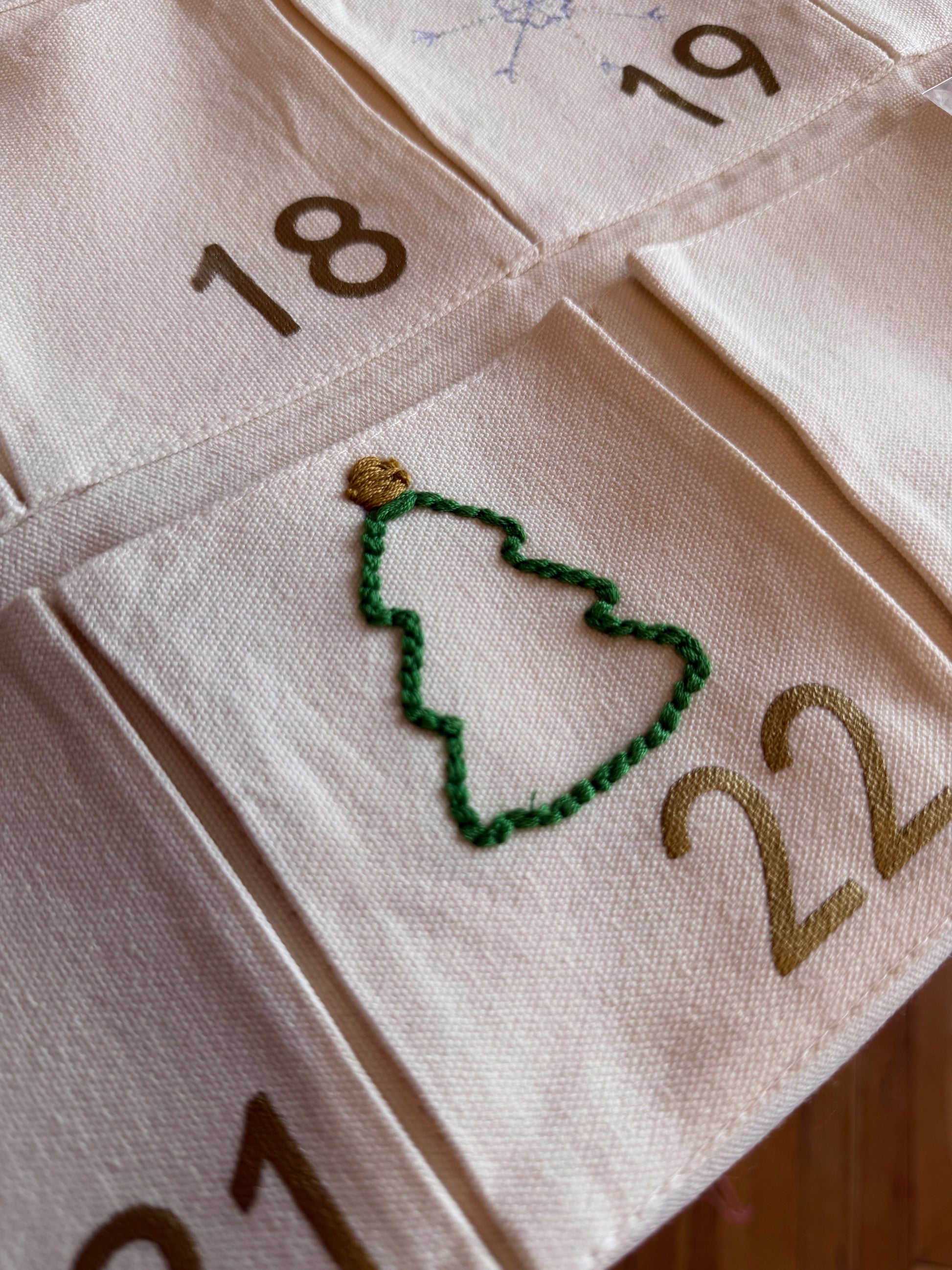 • 1 брой ръчно избродиран адвент календар, с размери 45 на 90см
